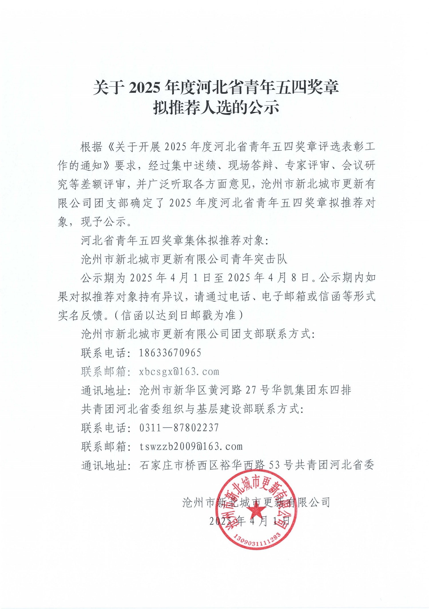根據《關于開展2025年度河北省青年五四獎章評選表彰工作的通知》要求,經過集中述績、現場答辯、專家評審、會議研究等差額評審,并廣泛聽取各方面意見,滄州市新北城市更新有限公司團支部確定了2025年度河北省青年五四獎章擬推薦對象,現予公示。
