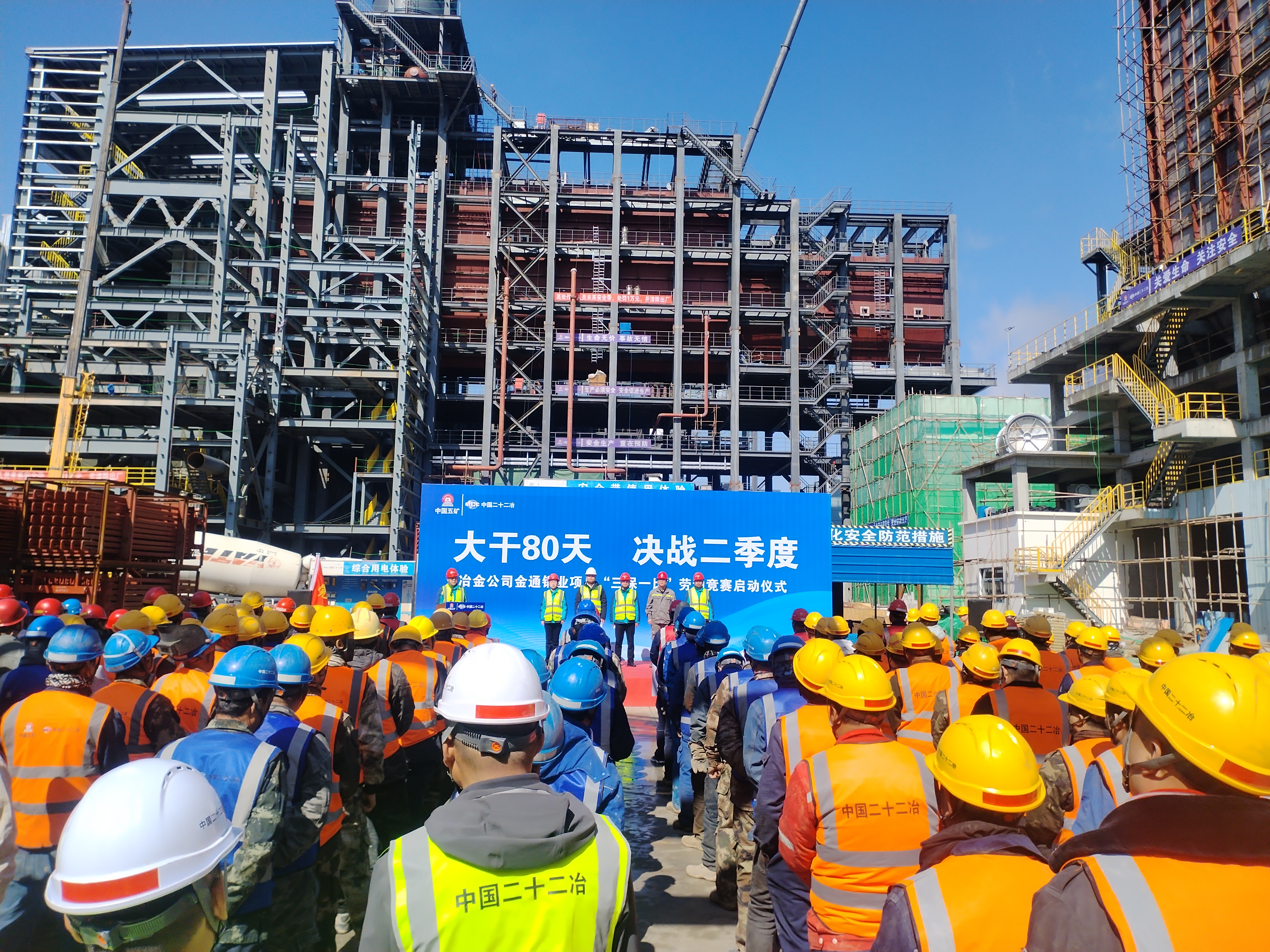 4月10日,冶金公司金通銅業(yè)項(xiàng)目開展“大干80天 決戰(zhàn)二季度”——“三保一比”勞動(dòng)競(jìng)賽啟動(dòng)儀式。冶金公司黨委書記、工會(huì)主席、副總經(jīng)理韓劍出席儀式,副總經(jīng)理安云主持儀式。